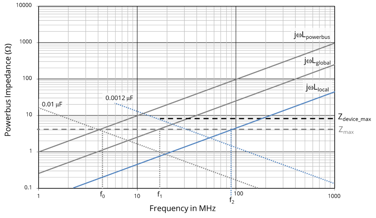 The maximum allowable power bus impedance is indicated by the horizontal dashed line in the plot above. Note that power bus impedance exceeds the maximum allowable impedance at frequencies greater than,