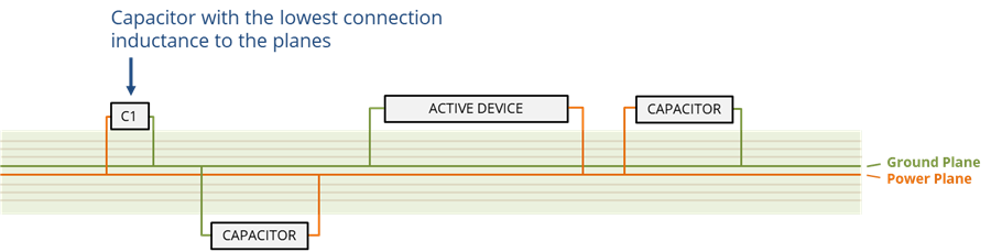 The figure below illustrates the cross-section of a board with power planes containing an active device and three decoupling capacitors. Note that for any given connection between the active device and a capacitor, the loop area between the planes is small relative to the area associated with the connections to the planes. Also, the planes are wide relative to the connecting via diameters, so the magnetic flux wrapping the planes is weak. The value of the connection inductance is dominated by the connection between the active device and the planes and the connections between the capacitors and the planes. In this example, the capacitor on the far left is connected through vias that are near each other and has the lowest connection inductance to the planes. This capacitor will provide more decoupling current to the active device than the other capacitors even though it is located farther away.