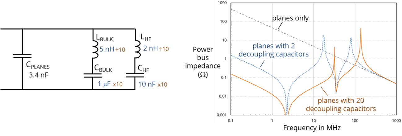 The power bus impedance is very low near the self-resonant frequency, but above that the bulk capacitor becomes an inductance, and impedance rises with increasing frequency. Eventually, the inductance of the bulk capacitor exhibits a parallel resonance with the remaining capacitors. At this parallel resonance, the impedance of the power bus peaks. As the frequency continues to increase, the smaller-valued capacitor with smaller connection inductance eventually goes self-resonant producing another null in the power bus impedance. But that null will be followed by another peak when both capacitors look like inductors and form a parallel resonance with the plane capacitance. At the parallel resonant peaks, the impedance of the power bus can be very high, and the board will tend to ring at these frequencies if there is not sufficient loss to dampen these resonances.