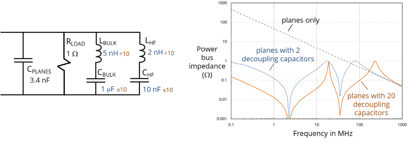 The decoupling bandwidth can be improved by adding more capacitors. Two identical capacitors in parallel have twice the capacitance and half the inductance of one capacitor. Ten times the number of capacitors will have ten times the capacitance and one tenth of the inductance. The impact of increasing the number of decoupling capacitors is illustrated below. With 20 decoupling capacitors instead of 2, the impedance is reduced and the frequency range over which the capacitors are effective is extended.