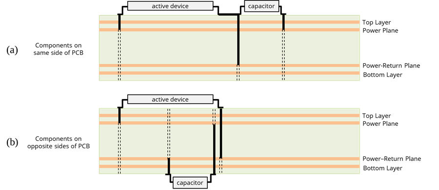 - Local decoupling capacitors should be connected between the power and power-return pins of the active device. The inductance of the loop formed by the capacitor/device connection should be minimized.