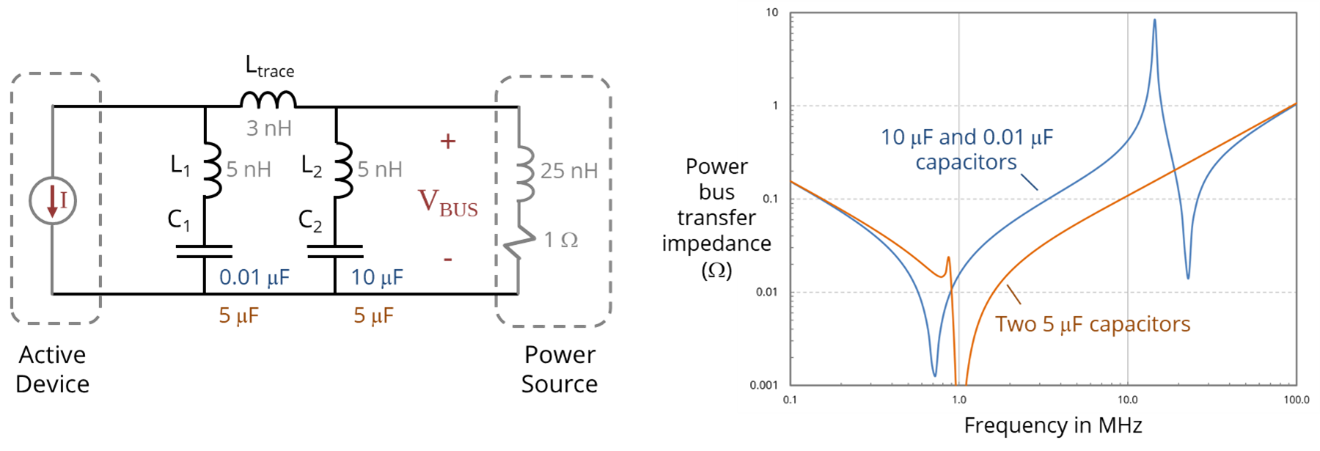 Sometimes it is advantageous to connect two local decoupling capacitors to the same power input [1] [2]. This might be done to get a larger overall capacitance, or to provide better filtering to the rest of the power bus. If two local decoupling capacitors are connected to the same power input, they should generally have the same nominal value. Otherwise, they may exhibit a strong parallel resonance in the middle of the frequency range where they are designed to operate. To illustrate this, consider the impedance of the two capacitors in the figure below. A 0.01-μF capacitor and a 10-μF capacitor are used to decouple an active device. Each has 5 nH of connection inductance. The transfer impedance (i.e., the ratio of the power bus voltage to the current drawn by the active device) exhibits a peak at about 22 MHz. This is the parallel resonance between the inductance of the larger-valued capacitor and the capacitance of the smaller-valued capacitor. In this circuit, a pulse of current drawn by the active device could cause the voltage on the power bus to ring at this frequency.