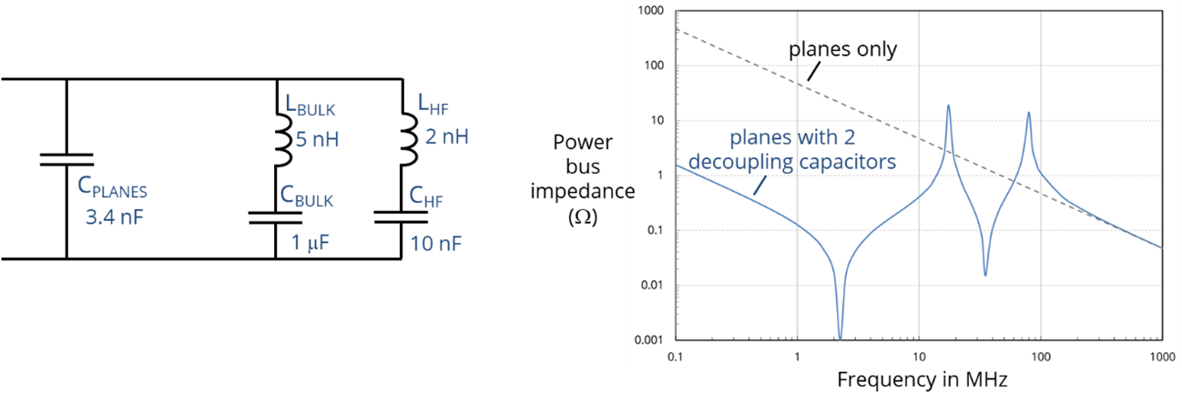 The circuit above models two capacitors connected to a pair of closely spaced planes. One of them, CBULK, is a large capacitor with a high nominal value intended to provide the capacitance needed for low-frequency decoupling. The other, CHF, has a small package size intended to facilitate the low-inductance connection to the planes needed for high-frequency decoupling.