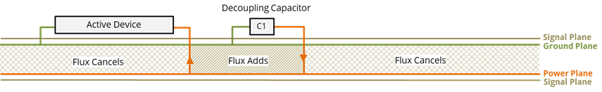 The figure below illustrates how this works. In this example, an active device and a decoupling capacitor are located on the top side of the board. The inductance between the planes is dominated by the magnetic flux that wraps the vias connected to the lower plane (in this case the power plane). The flux wrapping each via adds in the region between the two vias. However, the flux wrapping the vias cancels outside this region. The flux between the vias represents an inductance that is impeding the ability of the decoupling capacitor to supply current. The flux outside this region represents a mutual inductance that helps to pull charge from the decoupling capacitor [5], [6], [7].